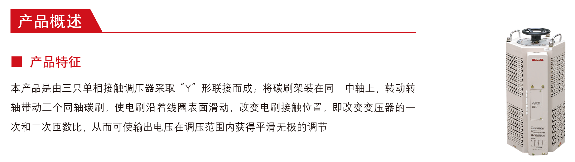 本产品是由三只单相接触调压器采取“Y”形联接而成 ;将碳刷架装在同一中轴上,转动转轴 带动三个同轴碳刷,使电刷沿着线圈表面滑动,改变电刷接触位置,即改变变压器的一次和二 次匝数比,从而可使输出电压在调压范围内获得平滑无极的调节