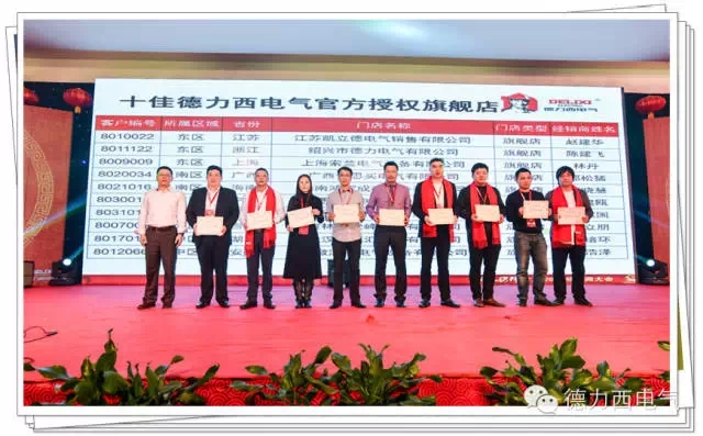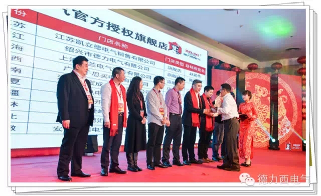 为鼓励在2014年积极创新,紧密协作的授权零售网络门店,在2月24号举行的德力西电气2015分销商大会上,公司领导向来自全国各地的10家优秀授权旗舰店负责人颁发了“十佳德力西电气官方授权旗舰店”奖状和奖金。